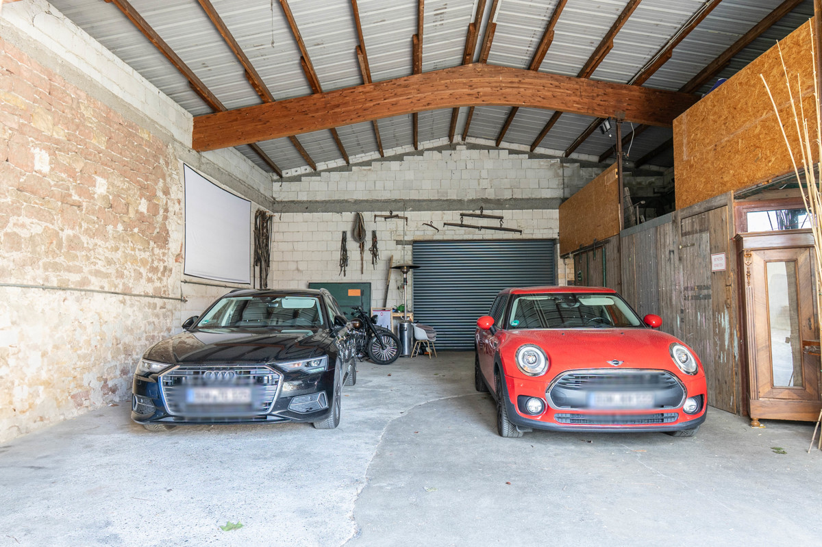 Zur Immobilie gehört außerdem eine großzügige Halle, erbaut im Jahr 1974, mit ca. 140 m² Nutzfläche und elektrischen Rolltoren. Sie bietet vielfältige Nutzungsmöglichkeiten, etwa als Werkstatt, Lagerfläche oder für Hobby und Gewerbe.